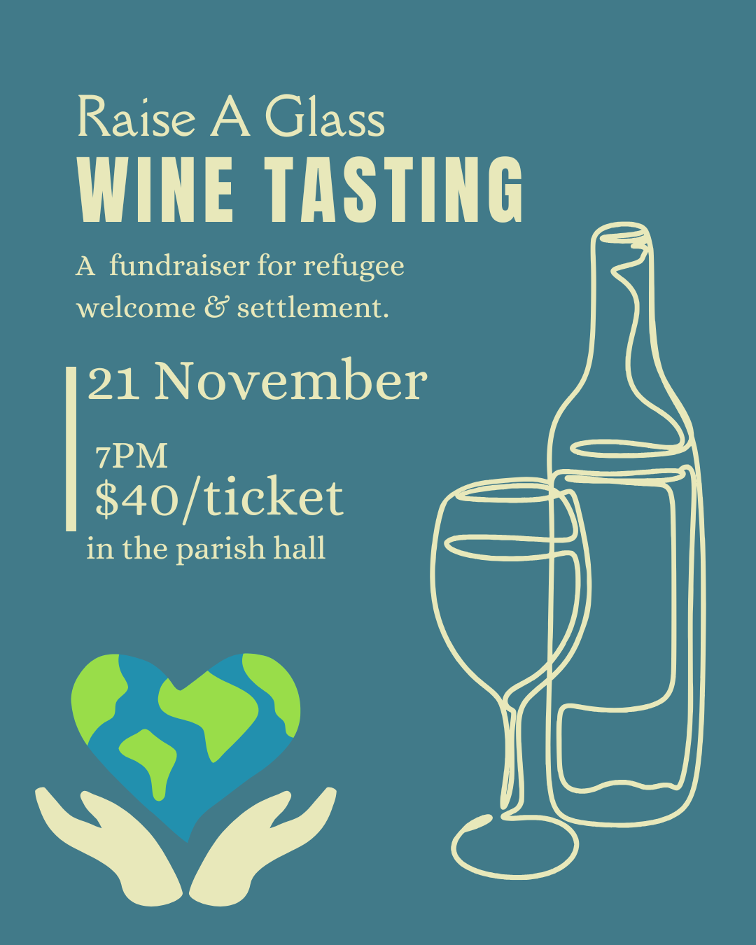 Christ Church is gearing up to welcome a Syrian family to Canada. They have been waiting in Lebanon for close to eight years and we are hopeful their arrival will be soon. In preparation, our parish needs to raise $80,000 to support them for a year. The good news is that with your generous donations we have raised just over $40,000 already. We need to raise $40,000 more! Please join us on Friday November 21st for an opportunity to learn a bit more about some fabulous wines with a tasting hosted by our own Denise Brisson, owner of Cellar Stock Importers. There will also be a small silent auction, an opportunity to hear more about the family who we are supporting as well as ways you can support their welcome and settlement.